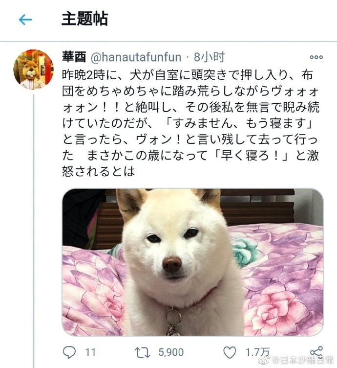 昨晚2点的时候,狗子突然冲进我的房间,狂踩我的被子并汪汪叫,然后无言地盯着我,听我说完「对不起,我这就去睡」后,它又汪地一声飘然而去。万万没想到竟在这个年纪被一只汪教训「给我早点睡!」 @日本沙雕日常