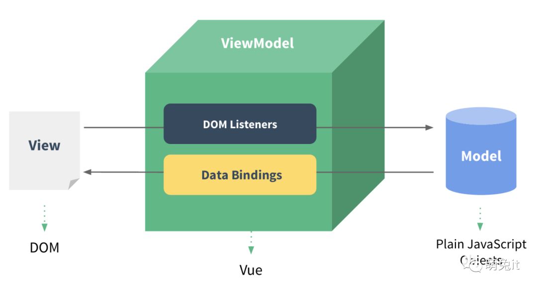 这个图就是一个MVVM的模型,View指的就是视图层,主要用于表现DOM节点;Model就是业务逻辑相关的数据对象,通常从数据库映射而来,我们可以说是与数据库对应的model;ViewModel就是与界面(view)对应的Model。因为,数据库结构往往是不能直接跟界面控件一一对应上的,所以,需要再定义一个数据对象专门对应view上的控件。而ViewModel的职责就是把model对象封装成可以显示和接受输入的界面数据对象,它是Vue.js的核心,它是一个Vue实例。Vue实例是作用于某一个HTML元素上的,这个元素可以是HTML的body元素,也可以是指定了id的某个元素,因此ViewModel的数据可以跟着view自动刷新,实现双向绑定。