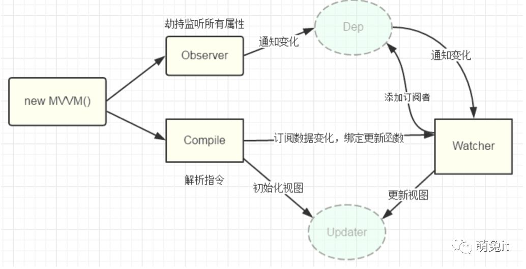 2)通过Compile解析指令,来将模板中的变量转化为数据,并初始化渲染视图,并通过Updater添加更新指令对应节点的更新函数,从而添加数据订阅者,当数据变动时,订阅者收到通知,更新视图。