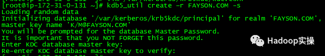 [root@ip-172-31-6-83 ~]# kdb5_util create –r FAYSON.COM -s
