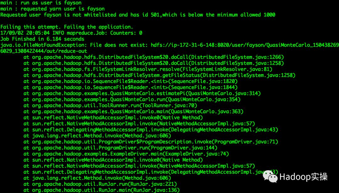 java.io.FileNotFoundException: File does not exist: hdfs://ip-172-31-6-148:8020/user/fayson/QuasiMonteCarlo_1504382696029_1308422444/out/reduce-out