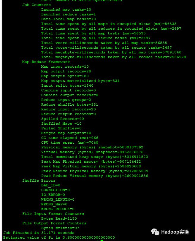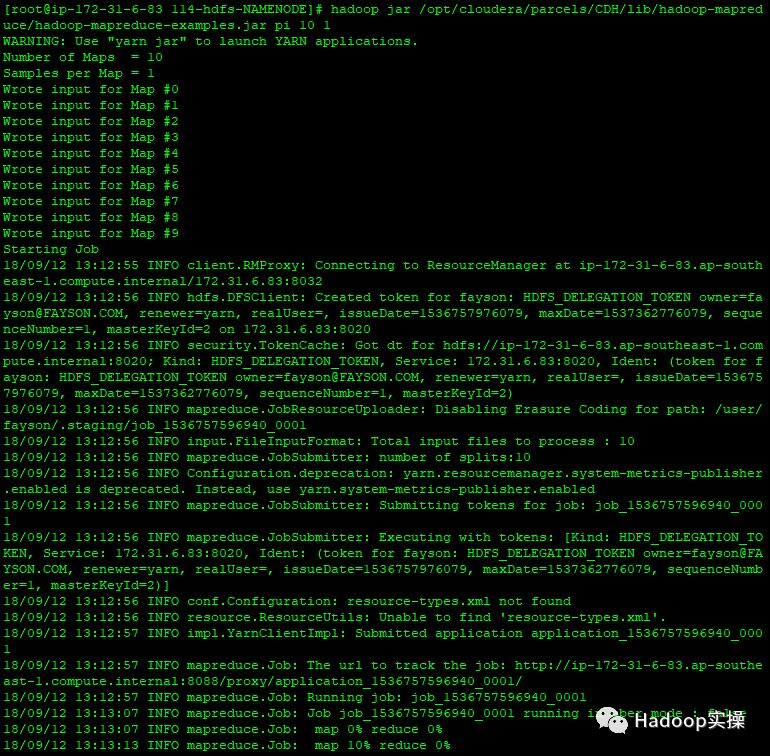 [root@ip-172-31-6-83 hadoop-mapreduce]# hadoop jar /opt/cloudera/parcels/CDH/lib/hadoop-mapreduce/hadoop-mapreduce-examples.jar pi 10 1