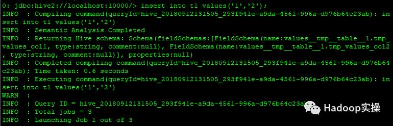0: jdbc:hive2://localhost:10000/> insert into t1 values('1','2');