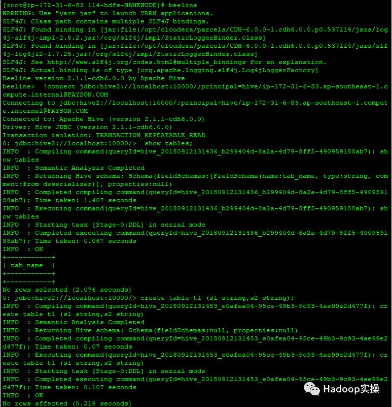 beeline> !connect jdbc:hive2://localhost:10000/;principal=hive/ip-172-31-6-83.ap-southeast-1.compute.internal@FAYSON.COM