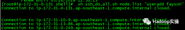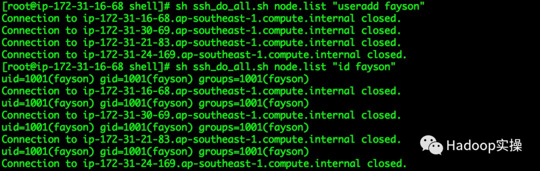 [root@ip-172-31-6-83 shell]# sh ssh_do_all.sh node.list "useradd fayson"