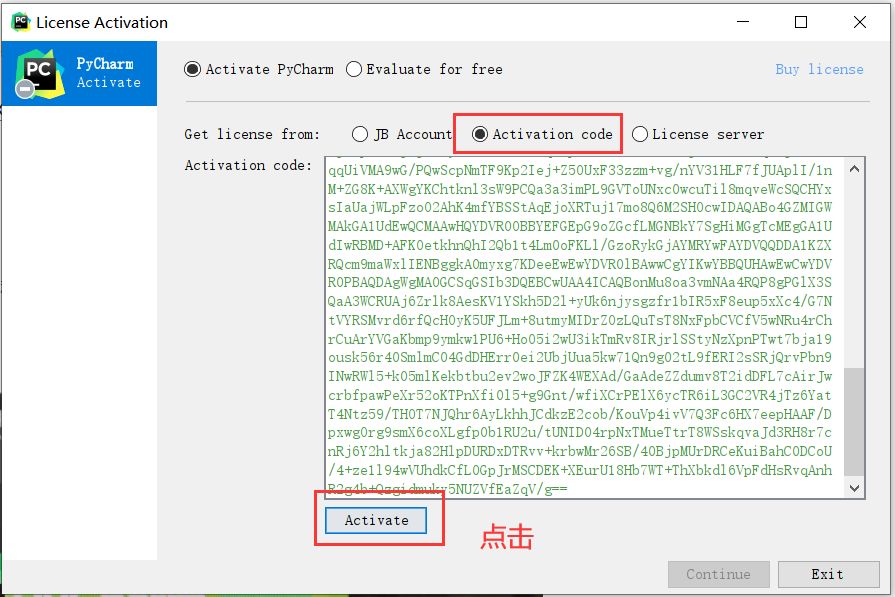在PyCharm License Activation的Activation code下输入激活码,然后点击Activate, continue下一步