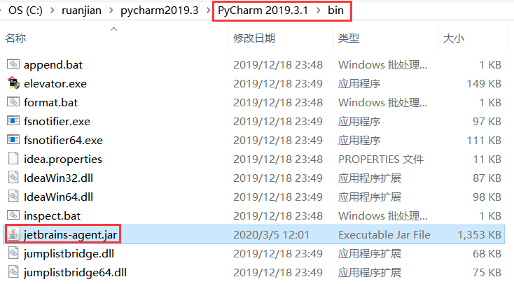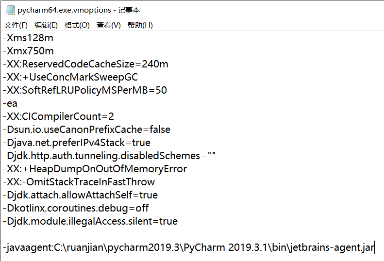 -javaagent:C:\ruanjian\pycharm2019.3\PyCharm 2019.3.1\bin\jetbrains-agent.jar