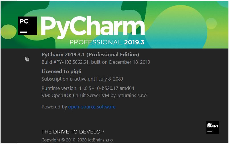 当你激活完毕后,启动pycharm,在菜单栏依次选择Help->About这里可以看到你的PyCharm的版本号及激活有效时间。