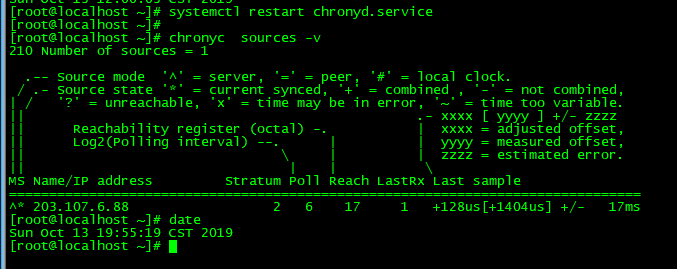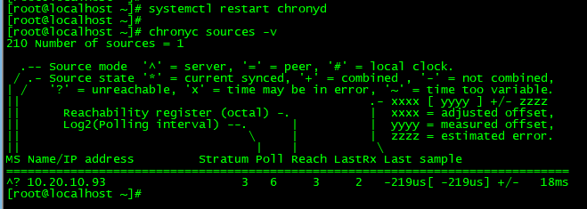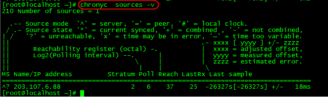 运行 chronyc sources 命令去显示当前时间源的信息 -v显示详细信息