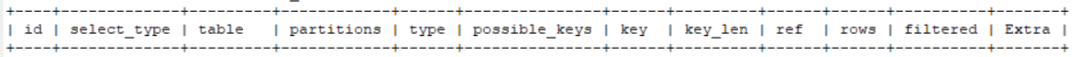 | id | select_type | table | partitions | type | possible_keys | key | key_len | ref | rows | filtered | Extra |