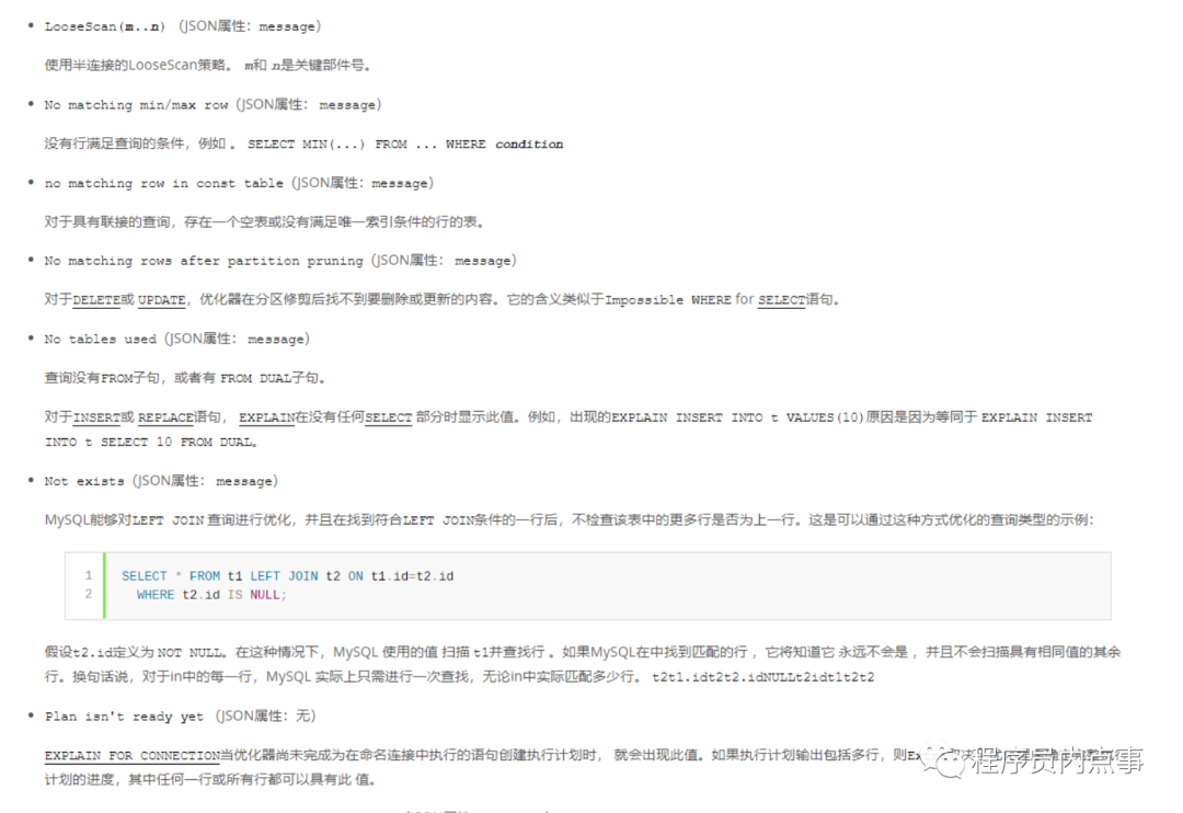 Extra列的信息非常非常多,这里就不再一一列举了,详见 MySQL官方文档 :https://dev.mysql.com/doc/refman/5.7/en/explain-output.html#jointype_index_merge