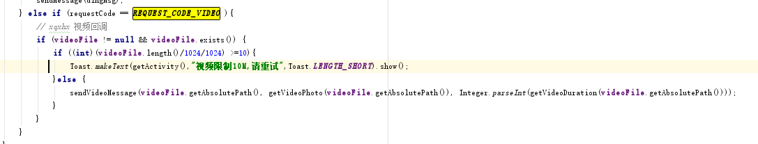 注:这里做个限制,视频大小上限为10M,然后执行sendVideoMessage()方法,参数分别为视频文件目录,视频缩略图文件目录,视频的时长,方法如下:
