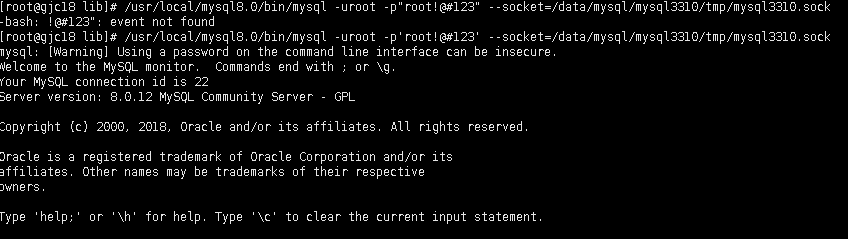 [root@gjc18 lib]# /usr/local/mysql8.0/bin/mysql -uroot -p'root!@#123' --socket=/data/mysql/mysql3310/tmp/mysql3310.sock
