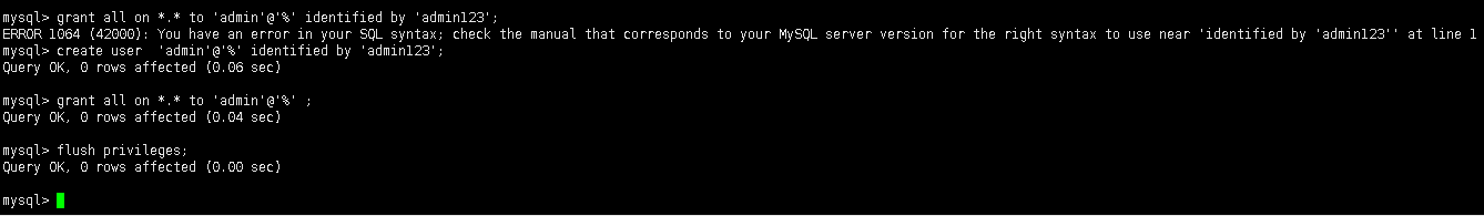 mysql> grant all on *.* to 'admin'@'%' identified by 'admin123';