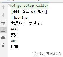 package mainimport "fmt"func say(name string, content ...string) {fmt.Println(content) //结果:[666 双击 ok 哦耶]fmt.Printf("%T\n", content) //结果:[]string,是切片类型fmt.Println("我是"+name, "我说了:")//循环切片for _, v := range content {fmt.Println(v)}}func main() {//函数名+括号调用函数say("张三", "666", "双击", "ok", "哦耶") //结果:我终于会说话了...}