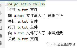 package mainimport "fmt"func main() {//模拟一个打开文件,写入一行内容进入文件,在关闭文件的功能var file_name = "a.txt" //文件名var w_content = "爱我中华" //写入的内容fmt.Println(fmt.Sprintf("打开 %s 文件",file_name))fmt.Println(fmt.Sprintf("向 %s 文件写入了 %s ", file_name, w_content))fmt.Println(fmt.Sprintf("关闭 %s 文件",file_name))//如果再再向其他文件写入内容,还需要复制一次var file_name2 = "b.txt" //文件名var w_content2 = "中国威武" //写入的内容fmt.Println(fmt.Sprintf("打开 %s 文件",file_name2))fmt.Println(fmt.Sprintf("向 %s 文件写入了 %s ", file_name2, w_content2))fmt.Println(fmt.Sprintf("关闭 %s 文件",file_name2))}