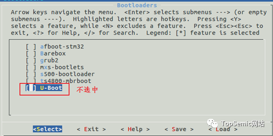 系统引导程序。包括 Barebox、mxs-bootlets、U-boot等。因为这里我不在Buildroot里编译Uboot,所以不做配置。默认是选择了Uboot的,这里把它取消掉。