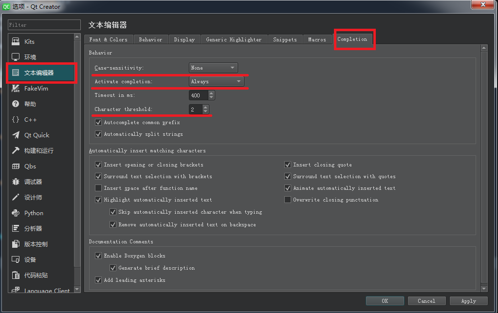 我们在使用QtCreator编程时,希望IDE能够自动进行代码提示,补全,便于程序员使用。在这里我把自己的设置和使用心得与大家分享,希望能够对你有所帮助,如有不对,希望能够指出,帮助我进步。谢谢。 打开QtCreator,选择“工具--选项”,然后选择如图所示: 最主要是最后一行标红,这个是进行代码提示的阈值设置,我这里设置的当输入2个字符时进行代码提示。 来源:oschina链接:https://my.oschina.net/weiweiqiao/blog/4880822 标签 Qt Creator