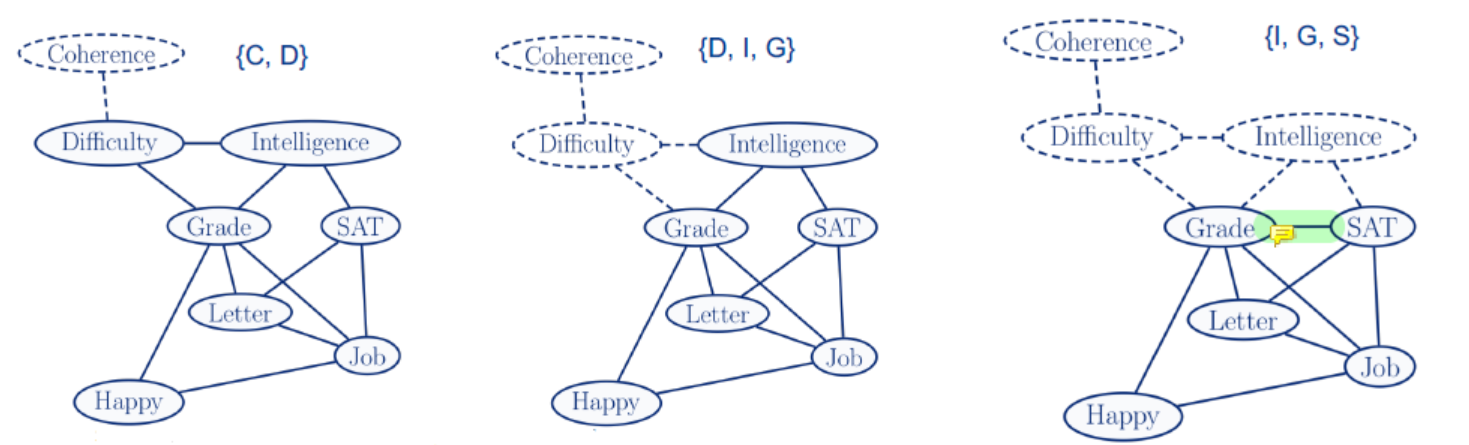 - 添加 fill-in edges:节点 N 的所有 neighbor 要互相连接,以确保相关性信息不会被同时清除; 同时,保存节点 N 及其 neighbor 构成的 clique; 注意:如果给的图模型已经是弦图,可以证明步骤2能够被跳过。