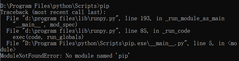 3、这时候,再次pip安装,提示: ModuleNotFoundError: No module named 'pip’