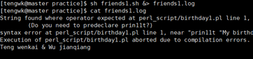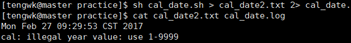 注意这里使用的是>>,若是>则内容会替代而不是累加。接下来我们修改shell脚本使cal参数错误,然后运行并输出错误信息: