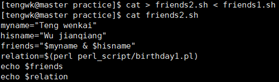 其中<<后面跟的是结束输入的关键词。采用<我们还可以使用文件来代替标准输入,例如将friends1.sh的内容作为标准输入写入一个新的文件friends2.sh,示例如下: