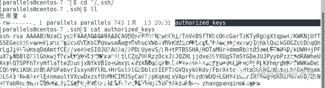 运行上述命令将公钥内容拷贝到 /home/parallels/.ssh/authorized_keys。