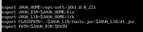 4、配置环境变量: 1.编辑文件 → 输入:vi /etc/profile 2.光标移动到最下面,按键盘“O”进入编辑模式 3.在最后加入如下:(JAVA_HOME 是你的JDK路径,以自己实际安装路径为准) export JAVA_HOME=/opt/jdk1.8.0_221 export JAVA_BIN=$JAVA_HOME/bin export JAVA_LIB=$JAVA_HOME/lib export CLASSPATH=.:$JAVA_LIB/tools.jar:$JAVA_LIB/dt.jar export PATH=$JAVA_BIN:$PATH