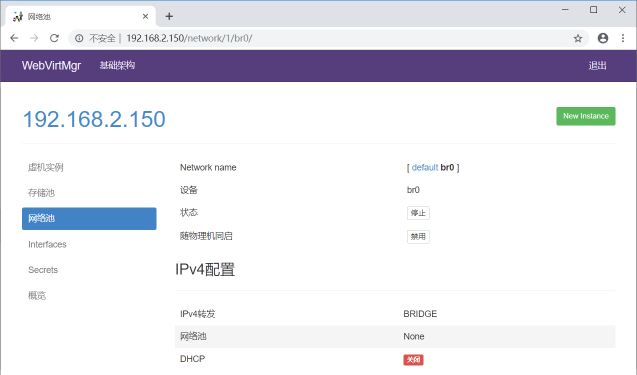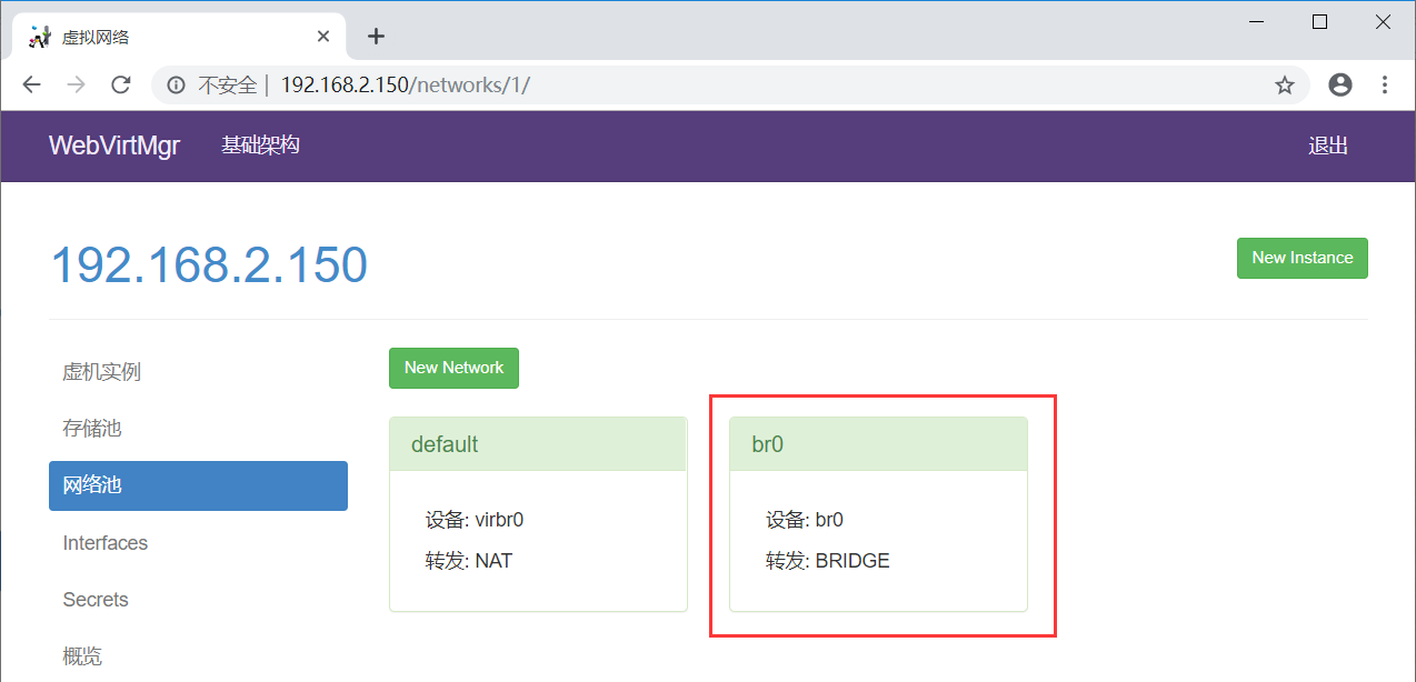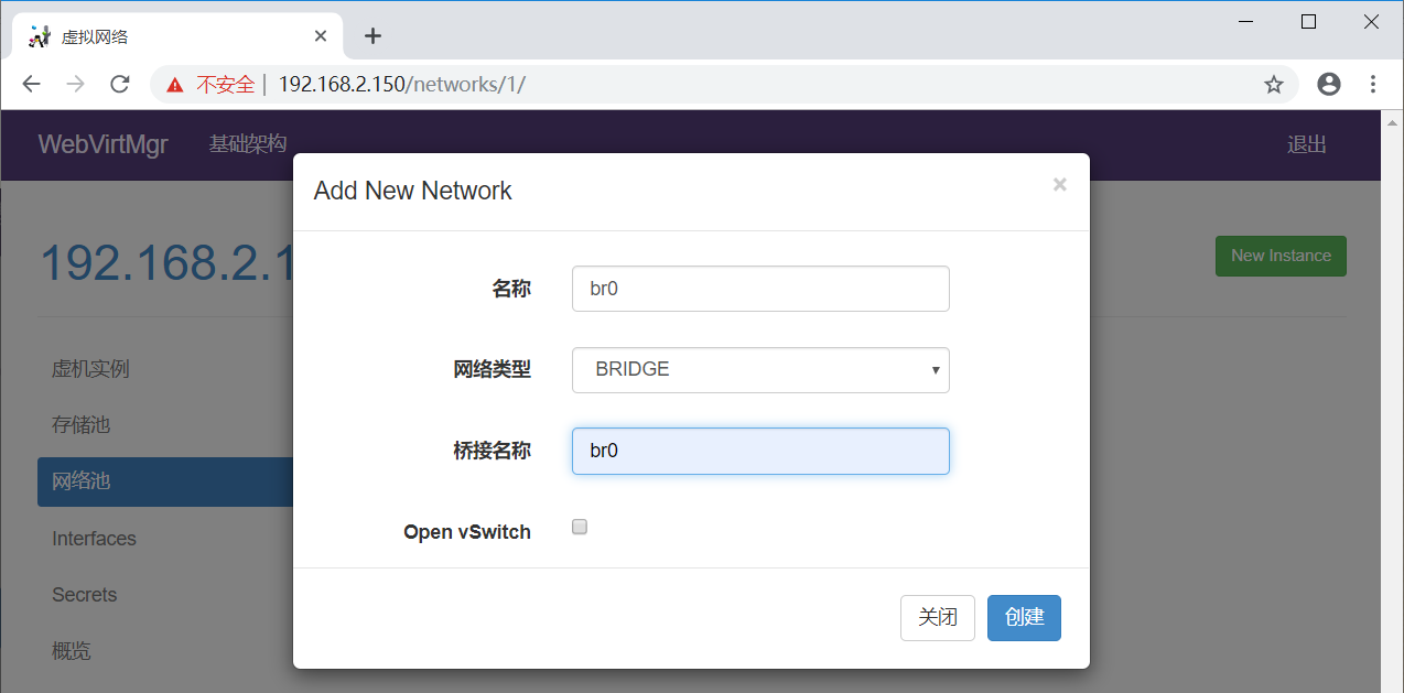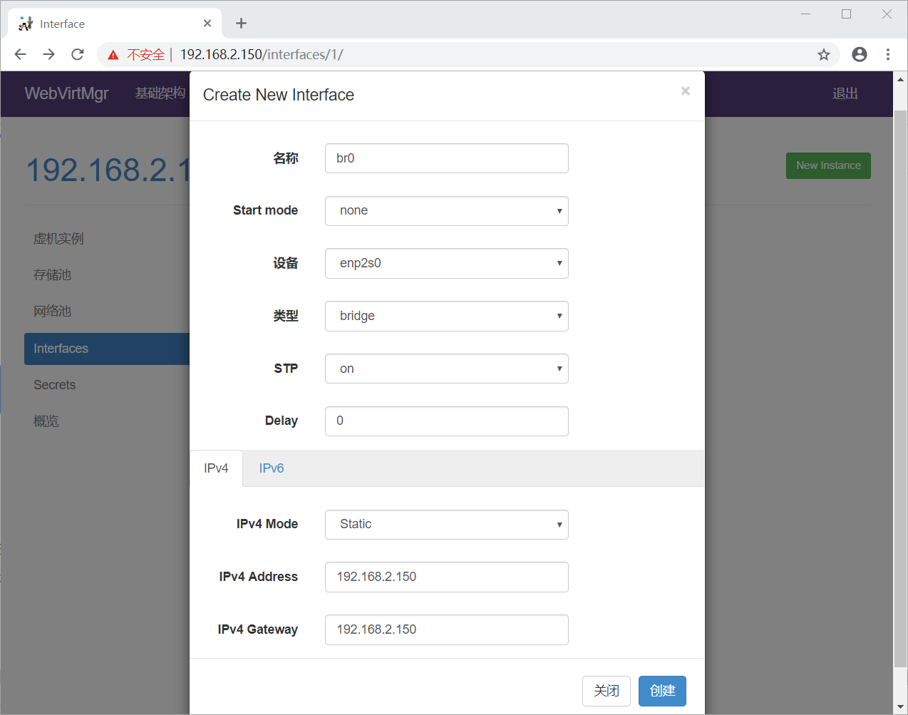 注意下面的“设备”一项要填写桥接的物理网卡(即br0对应的那个网卡,这里填的是宿主机之前的内网卡enp2s0)