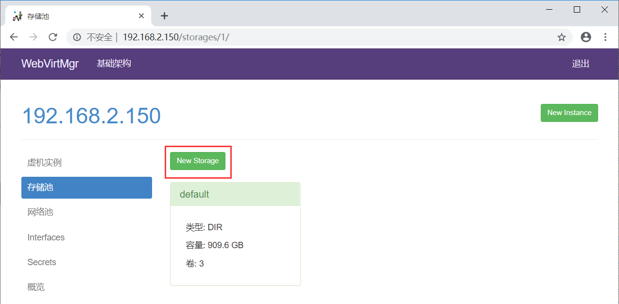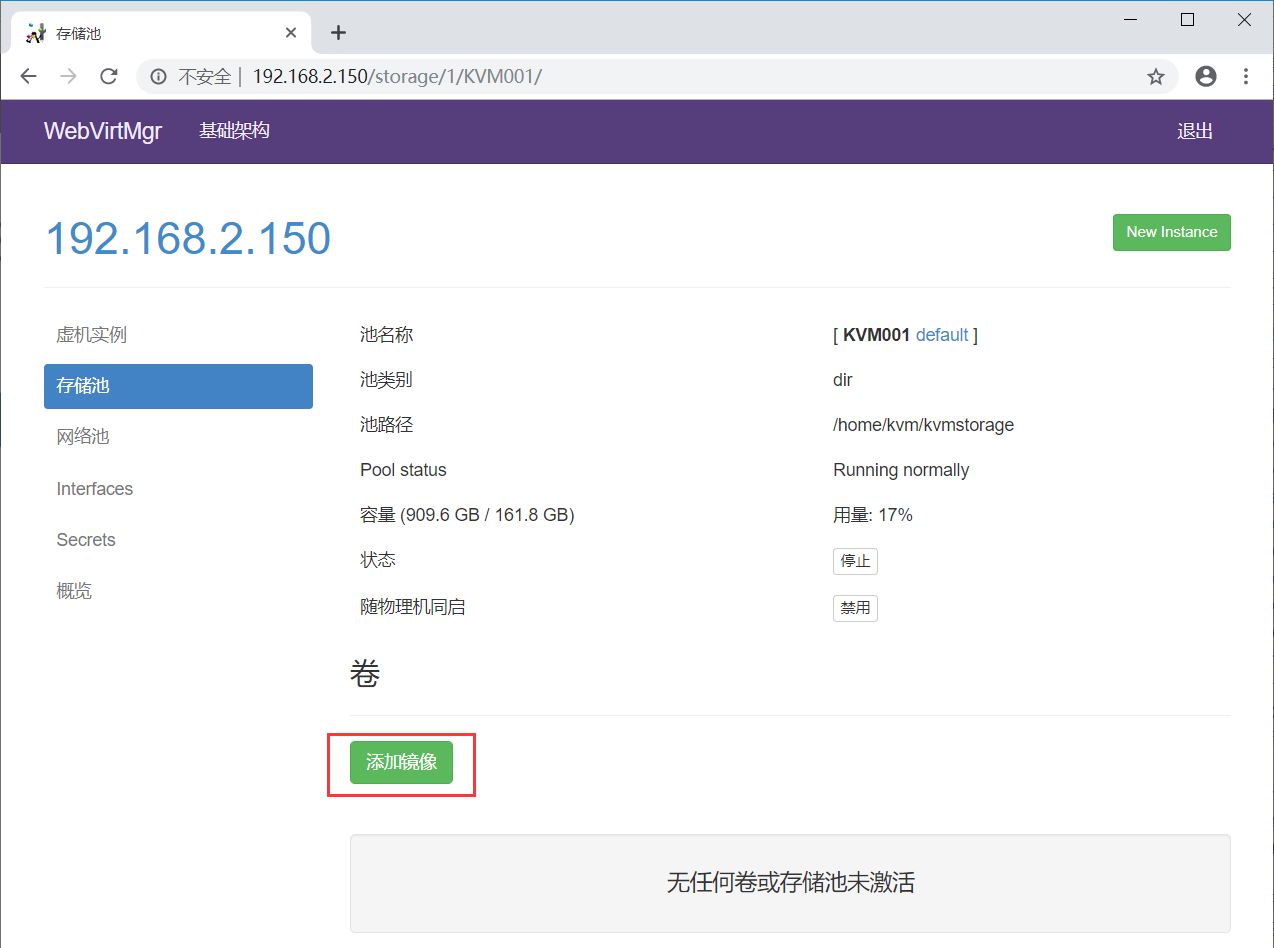 点击“存储池”按钮,创建存储池(即创建磁盘镜像存放的位置)