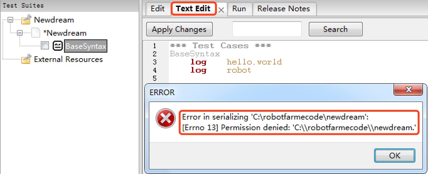 [Errno 13] Permission denied: 'C:\robotframeworkcode\newdream.'