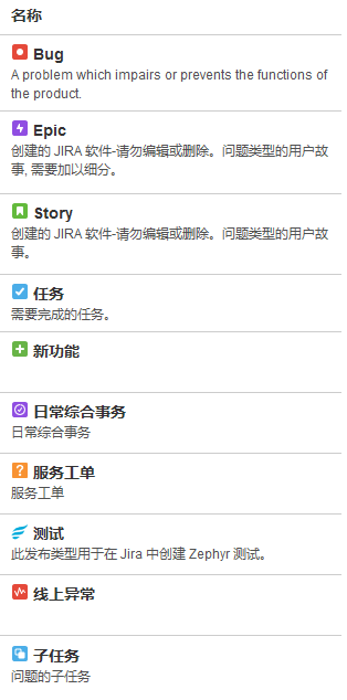 - 职能任务:Epic、Story、Task、新功能、子任务、测试