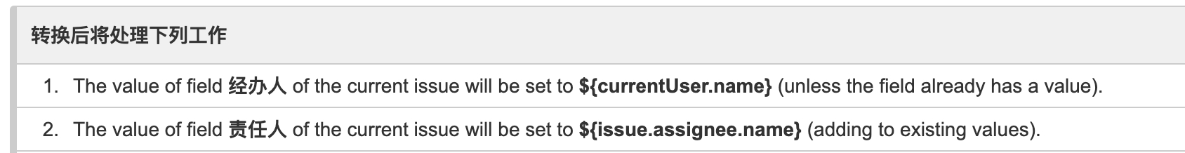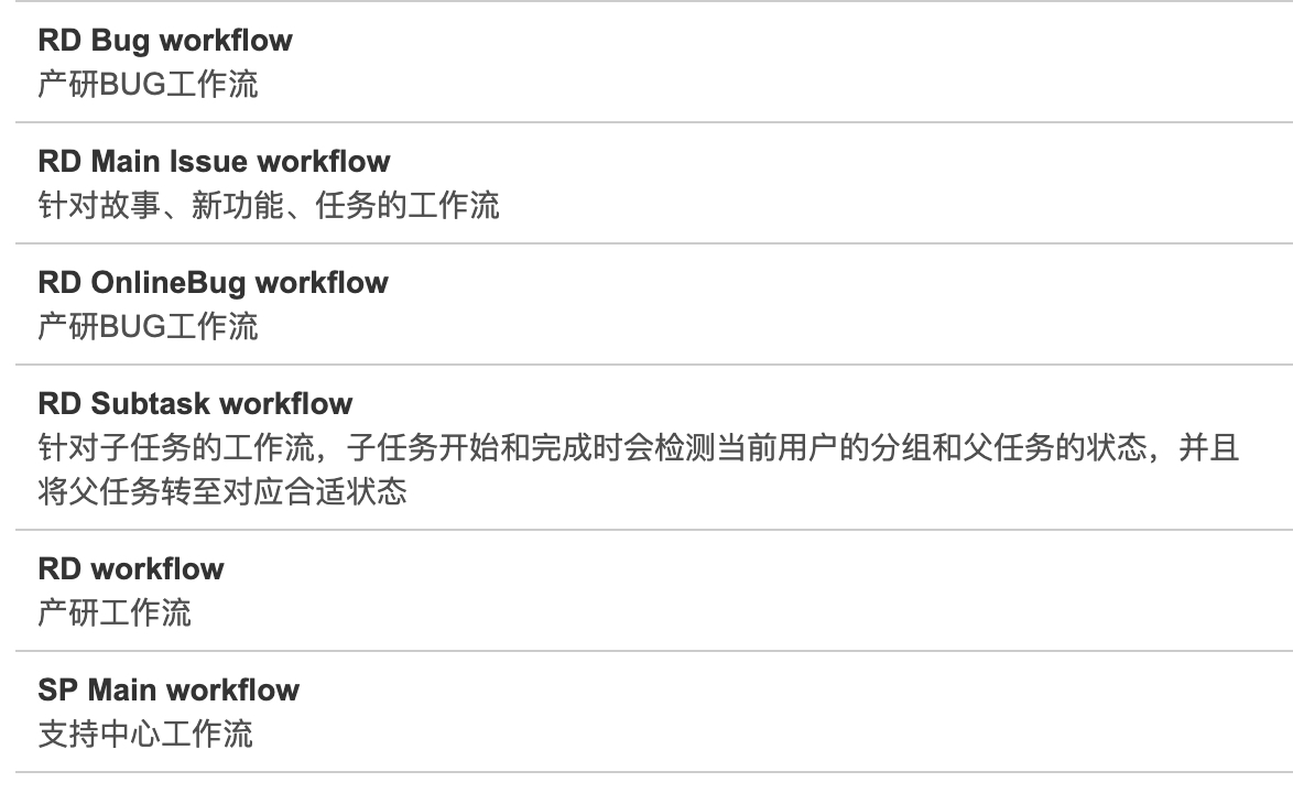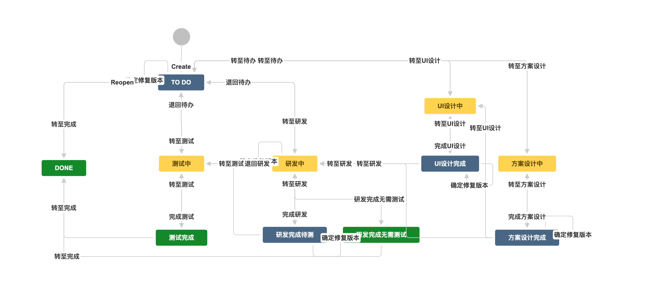 状态是分为三种颜色,蓝色:待办,黄色:进行中,绿色:完成。某个问题一定只会处于某一个确定的状态,会在问题的界面上直接显示。 除去一开始的待办和最终的完成,中间所有的环节,都分为进行中和完成两步。正常的工作流程完成之后还要等待下一环节的人员继续处理,所以单环节的完成状态颜色设定为蓝色。测试比较特殊,测试完成之后是可发布状态,所以可以设定为绿色。 这就是状态的设置建议。 命名就是针对状态和转换: 状态的命名建议是 XX中:进行中,XX完成:阶段性完成。 转换是连接源头状态和目标状态的线,在问题的界面上,实际上就是一个一个的按钮。建议的命名是以转换到某个阶段进行中状态时以转向+目标阶段,转换到某个阶段完成状态时以完成+目标阶段。 转换这么命名的好处有两个:
