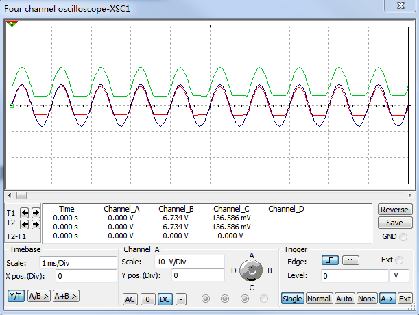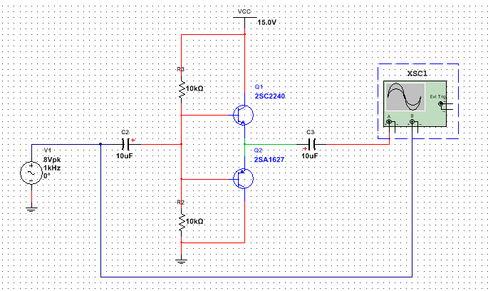上面的推挽电路用NPN组成的射极跟随器代替发射级电阻,只有一个二极管工作,且在没有输入信号时,两个二极管都不工作,电路功耗较低,电路的缺点是存在交越失真,故导通角小院180°,仿真中没有看到具体的现象,不知道为什么!??