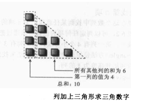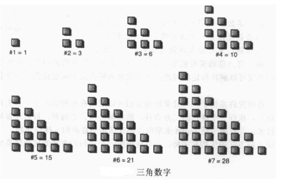 首先我们来看一组数字:1,3,6,10,15,21.....,在这个数列中第n项是由n-1项加n得到的,这个序列中的数字称为三角数字因为他们可以形象化地表示成一个三角形排列。如下图