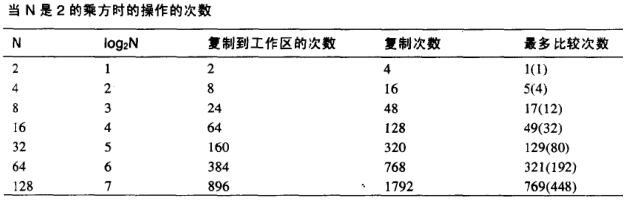 上表中可以看出来当N为2的乘方的时候的操作次数,我们可以这样来理解需要的复制次数,log2N表示将N对半分解为我们归并的基值1的时候需要的步数,然后每一步我们都需要将N个数据项复制到我们的工作区,所以复制到工作区的次数就应该是N*log2N,这些数据复制到工作区之后还需要复制到原数组中所以复制次数会增加一倍