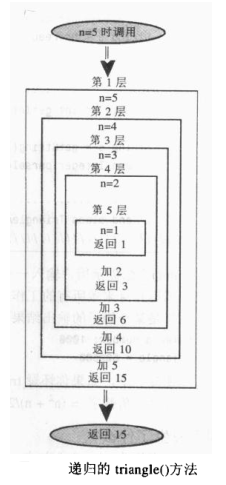 下图表示了递归triangle方法的执行过程,假设传入n=5,从5开始每次减1,不断进入方法自身,直到减到1时,方法进行返回,直到返回到最外层。注意,在方法返回1之前,实际上同时有5个不同的triangle()方法实例存在,最外层传入的参数是5,最内层传入的参数是1
