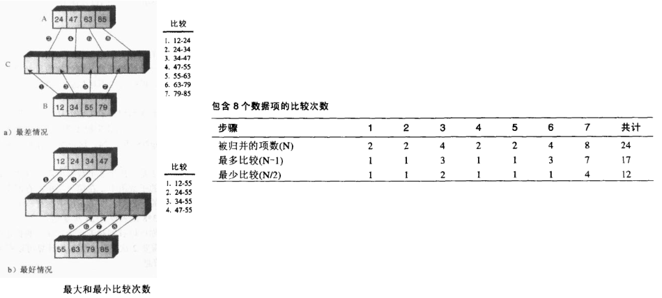 上图中我们可以前面表示进行归并的时候进行的最多和最少的比较次数,后表列举出了包含8个数据项进行归并排序的比较次数,对于八个数据项需要七次归并的操作,对于每一次归并最大比较次数是数据项减1,最小比较次数是数据项的一半,加在一起可算出归并排序需要的比较次数在12到17之间。
