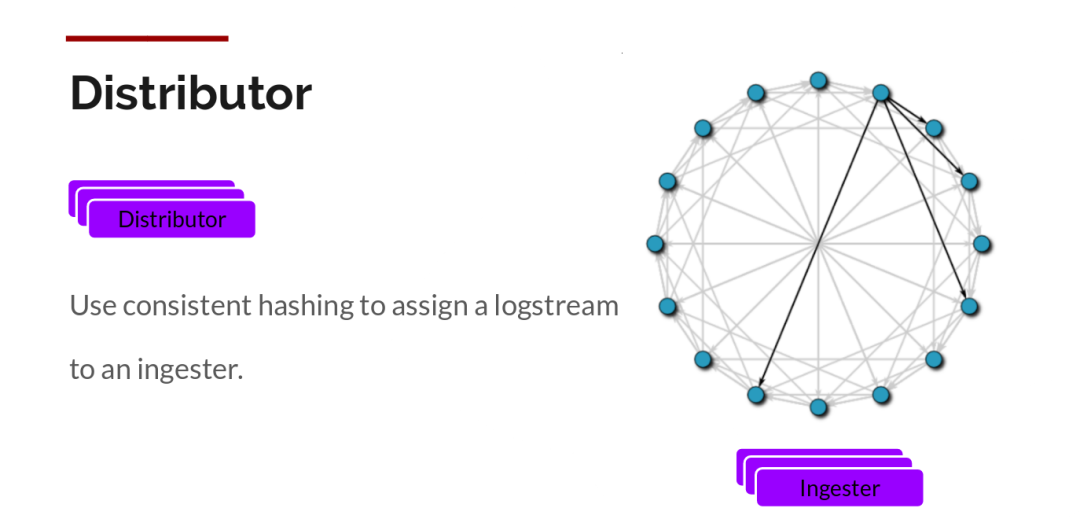 Loki通过构建压缩数据块来实现这一点,方法是在日志进入时对其进行gzip操作,组件ingester是一个有状态的组件,负责构建和刷新chunck,当chunk达到一定的数量或者时间后,刷新到存储中去。每个流的日志对应一个ingester,当日志到达Distributor后,根据元数据和hash算法计算出应该到哪个ingester上面。