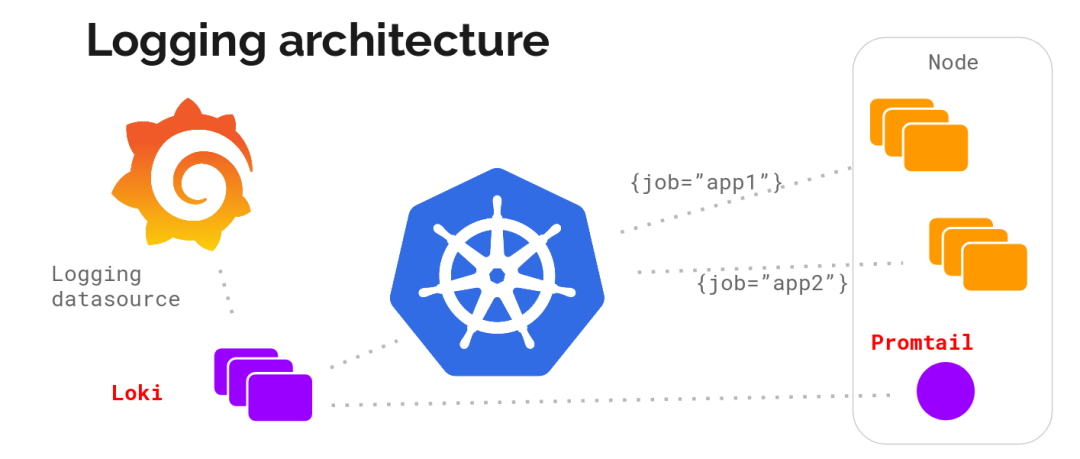 不难看出,Loki的架构非常简单,使用了和prometheus一样的标签来作为索引,也就是说,你通过这些标签既可以查询日志的内容也可以查询到监控的数据,不但减少了两种查询之间的切换成本,也极大地降低了日志索引的存储。Loki将使用与prometheus相同的服务发现和标签重新标记库,编写了pormtail, 在k8s中promtail以daemonset方式运行在每个节点中,通过kubernetes api等到日志的正确元数据,并将它们发送到Loki。下面是日志的存储架构: