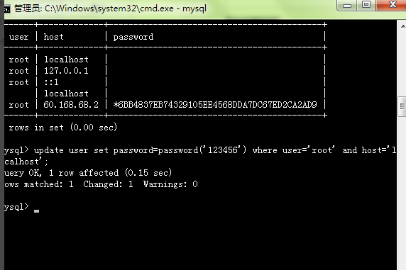 11、更改root密码,输入update user set password=password('123456') where user='root' and host='localhost';