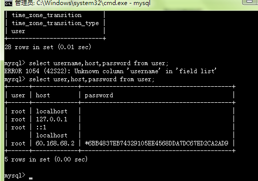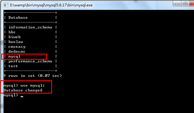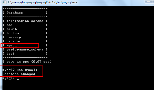 8.其中mysql库就是保存用户名的地方。输入 use mysql; 选择mysql数据库。