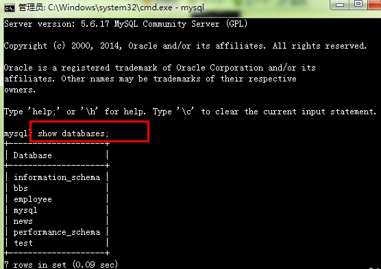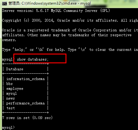 6.输入show databases; 可以看到所有数据库说明成功登陆。