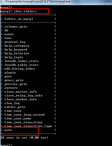 9.show tables查看所有表,会发现有个user表,这里存放的就是用户名,密码,权限等等账户信息。