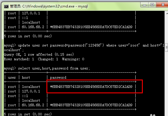 12.再次查看账户信息,select user,host,password from user; 可以看到密码已被修改。