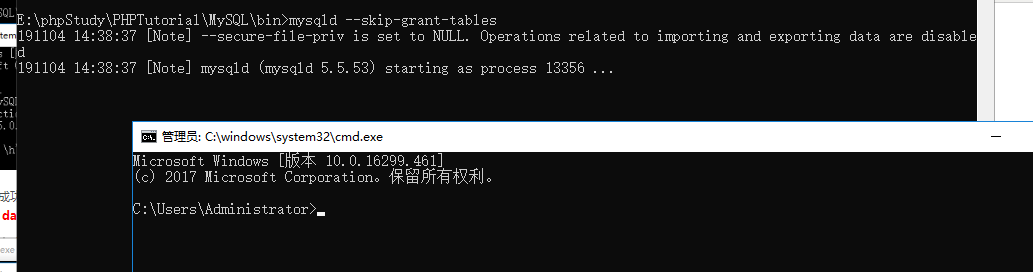 4,输入mysqld --skip-grant-tables然后回车,此时这个命令行就不能输入东西了,类似于卡了的状态,这时先不用管这个命令行,再打开一个新的命令行