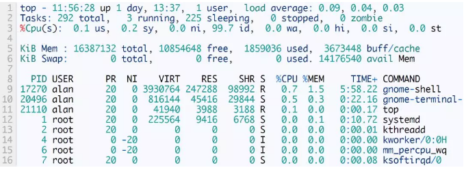 top 命令已经有很久的历史了,对于查看运行进程的细节和快速识别内存消耗等问题是非常有用的。其默认视图如下所示。