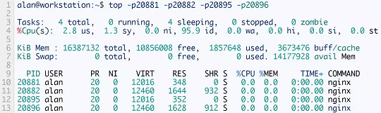 可以通过键入字母 s 和您喜欢的更新秒数来更改更新间隔。为了更容易监控我们的示例 Nginx 进程,我们可以使用 -p 选项并传递 PID 来调用 top。这个输出要干净得多。